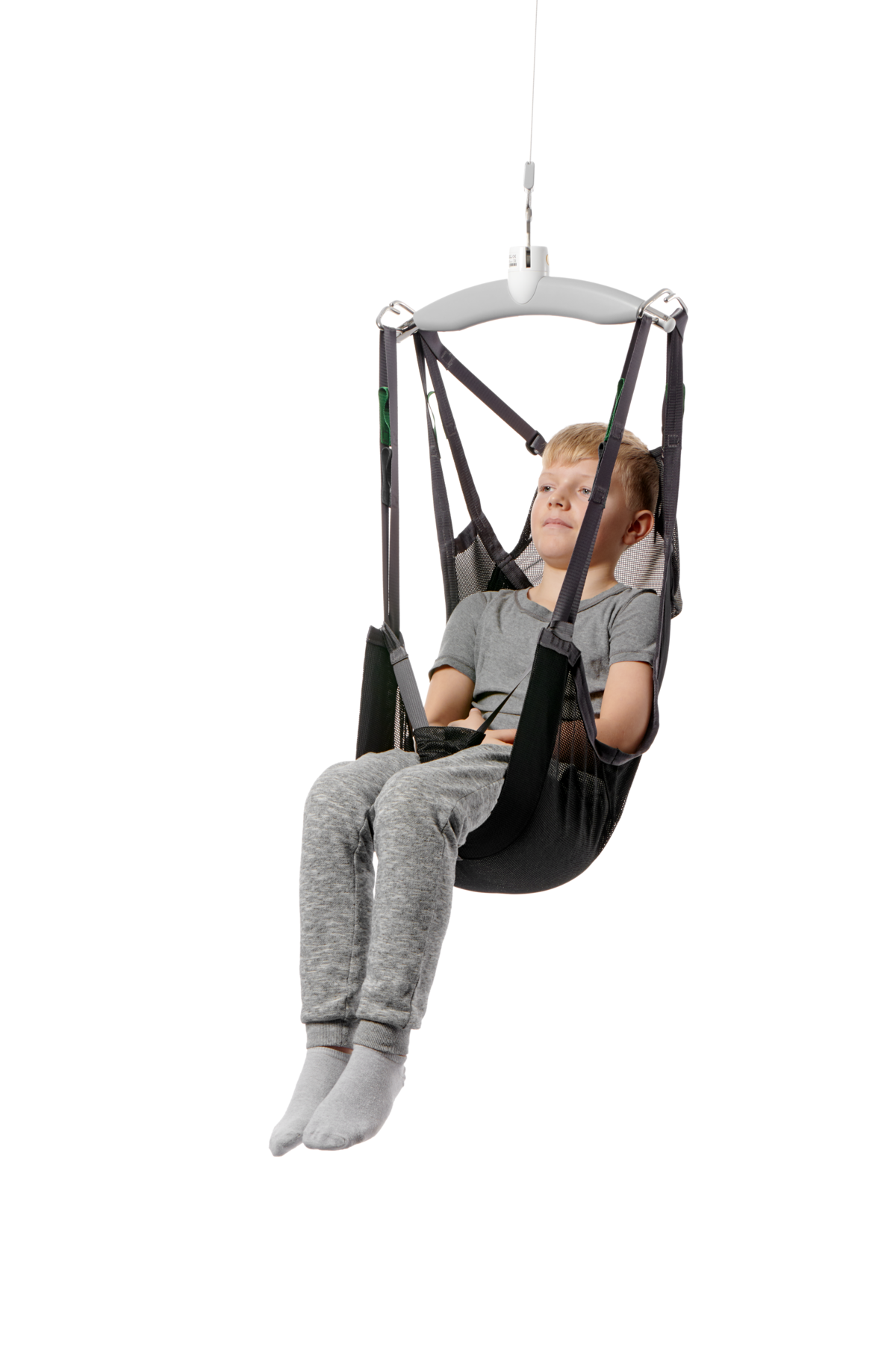 Styður undir læri, við bak og höfuð. Stuðningsbönd á milli lappa. Notandi situr ofan í seglinu. Hægt að setja höfuðstuðninginn niður þegar ef þörf er á.